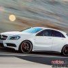 Com uma potência específica de 180 cavalos por litro, o Mercedes-Benz A45 AMG acelera de 0-100 em 4,6 segundos e sua máxima é de 250 km/h, limitada eletronicamente. O câmbio é automatizado de dupla embreagem com sete velocidades e a tração é 4Matic, integral.
