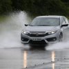 Na primeira passagem, aos 70 km/h, o Civic contornou a curva sem nenhum problema. Na volta seguinte, estabilizamos a velocidade em 75 km/h. Ao entrar na parte “molhada” da pista, os pneus dianteiros derraparam levemente e o carro ameaçou sair um pouco da trajetória. Mas logo recuperaram o atrito com o piso e o sedã permaneceu no caminho, após deslizar de leve a frente.